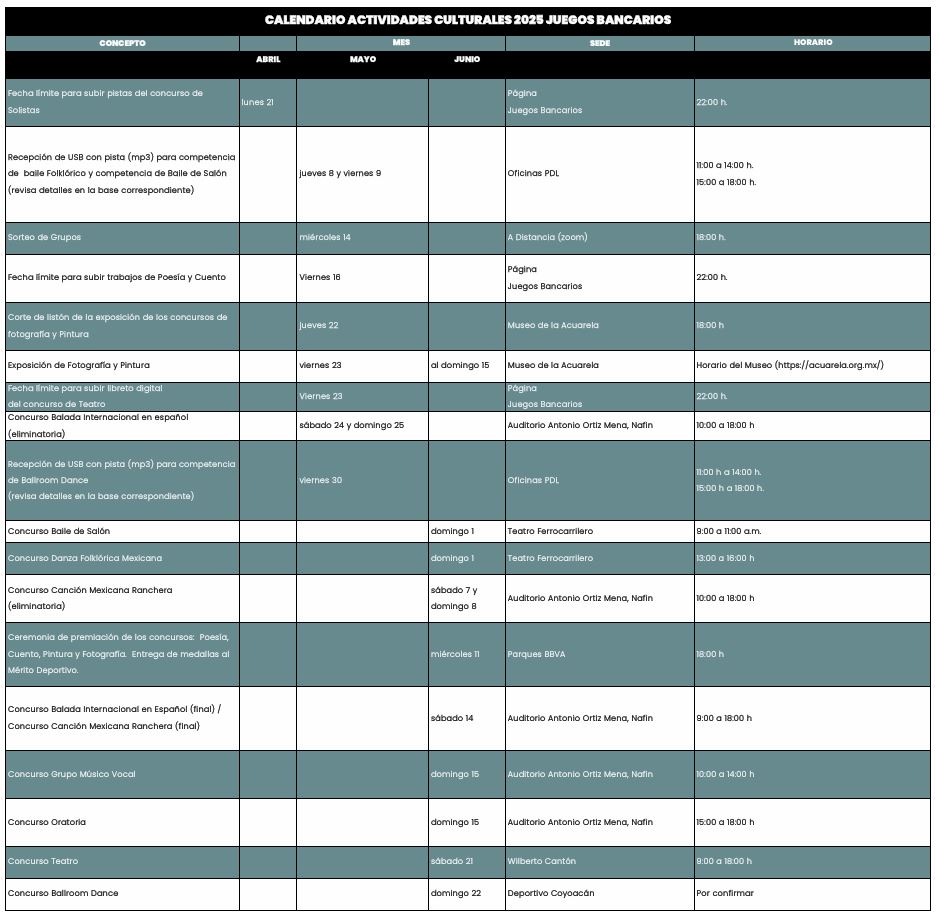 12.- En caso de la detección de plagio en alguna de las actividades culturales, el o la participante será objeto de descalificación, baja permanente y definitiva de Juegos Bancarios, no pudiendo volver a participar en ninguna actividad deportiva o cultural.